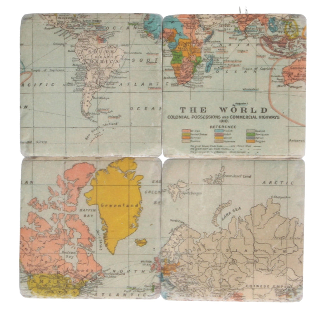 World Map Coaster Set- This elegant set of 4 World Map Coasters display a vintage-style world map design, capturing the spirit of adventure and exploration. Crafted from smooth, durable resin, these 4-inch coasters protect your surfaces while adding a touch of worldly sophistication to your home décor.