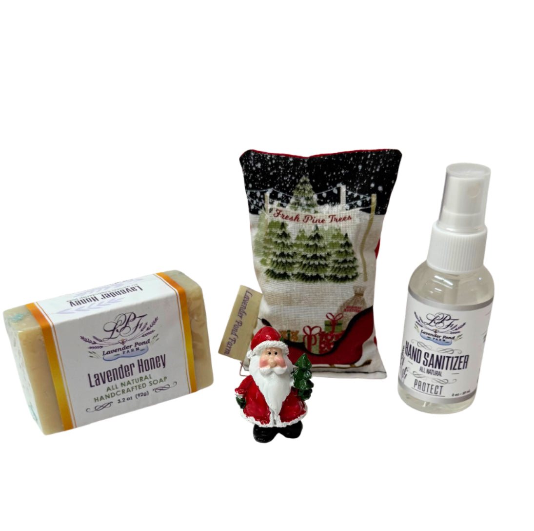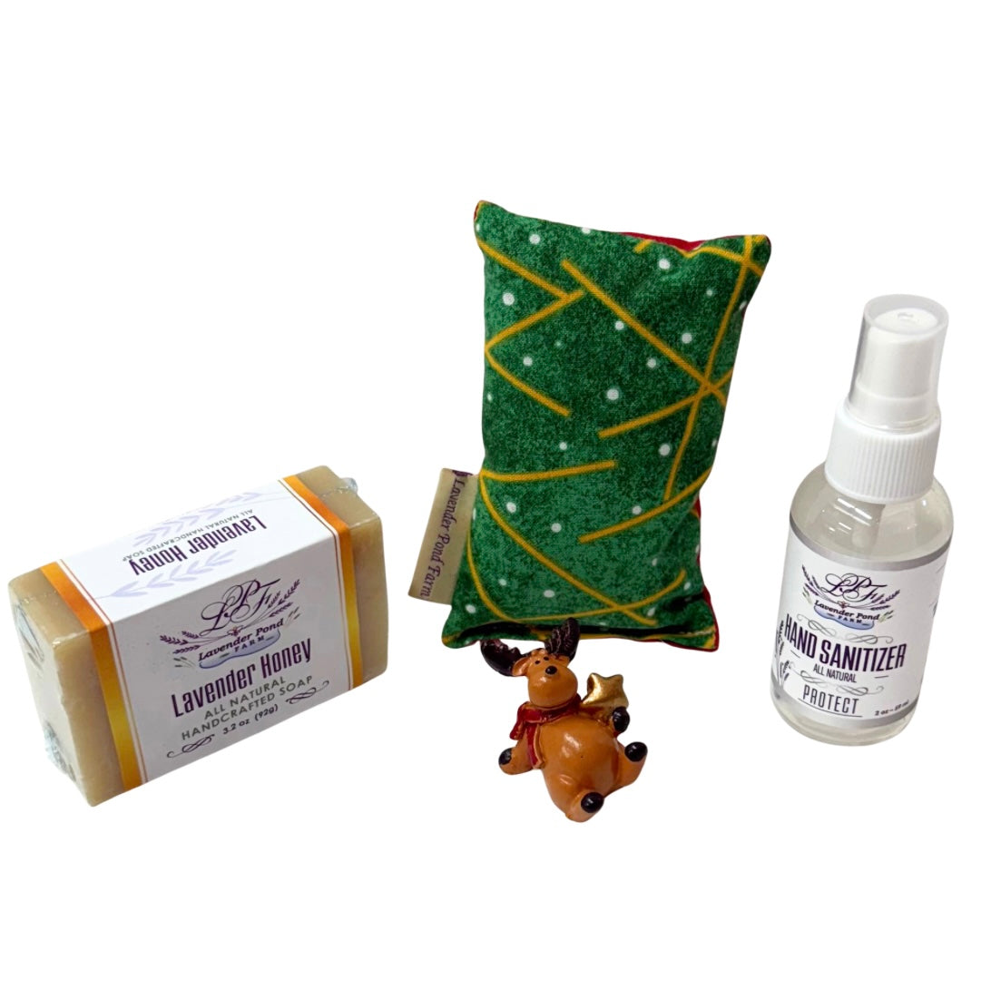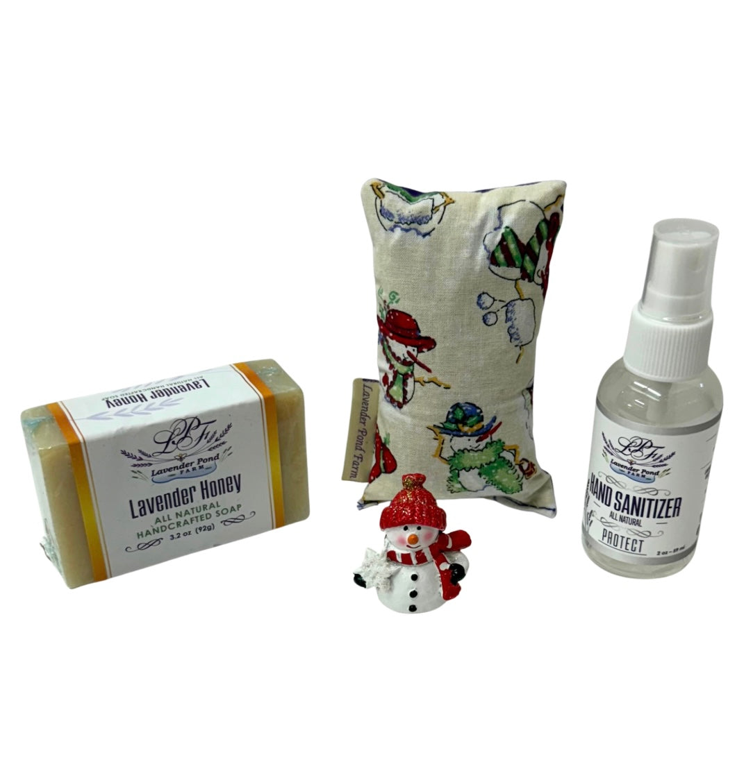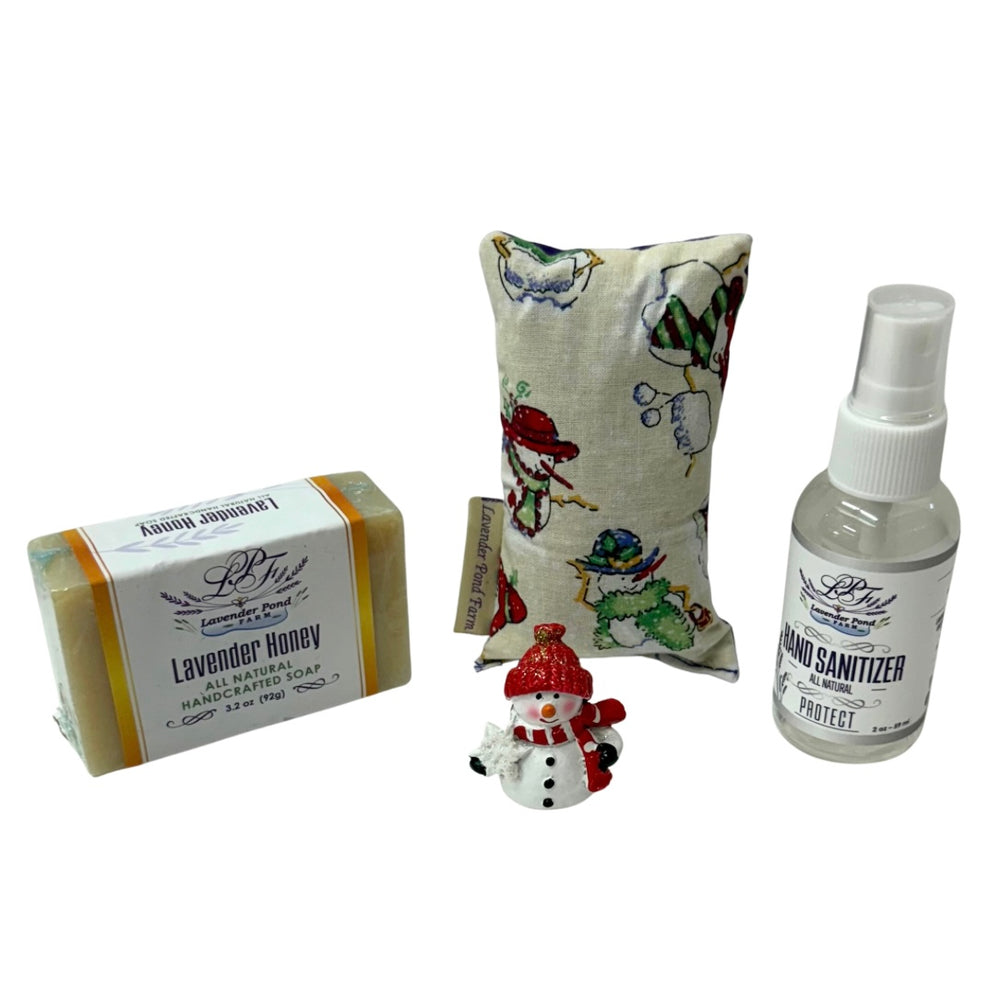 Includes a 2oz Lavender Hand Sanitizer, a Lavender Honey Bar Soap, a small Lavender Sachet and mini table top holiday figurine! Your choice of Snowman, Santa, Moose, or Cardinal.