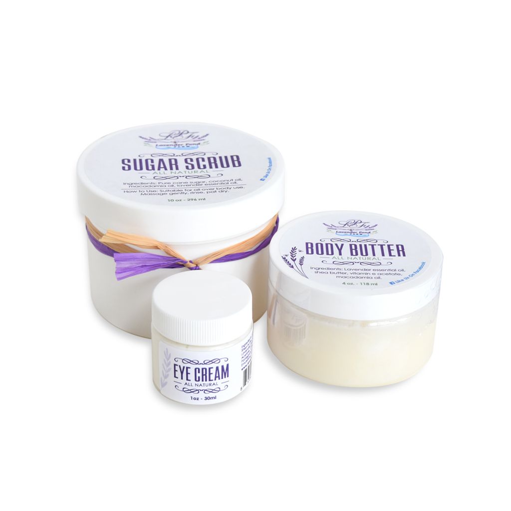 Lavish your skin with a trio of our farm favorites. A non-greasy and gently exfoliating Lavender Sugar Scrub, our soothing Lavender Eye Cream to help with puffiness and lines and our Lavender Whipped Body Butter to help heal dry skin.