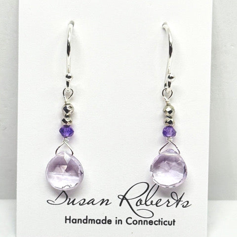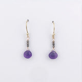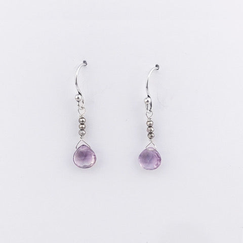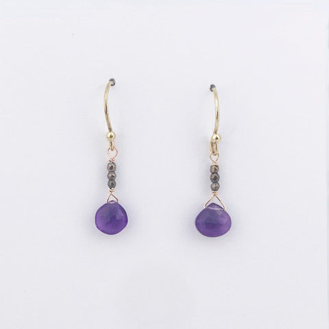 Raindrop earring 1” in length, sterling silver ear wire with hand cut pyrite and amethyst.
