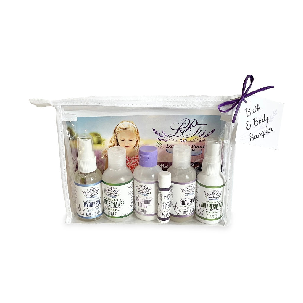All our Lavender Bath & Body goodness packaged in a beautiful reusable white trim cosmetic bag. Set includes: