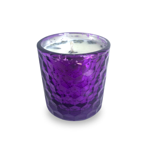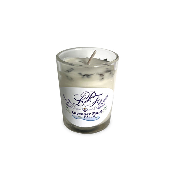 All natural soy wax is sprinkled with organic lavender buds and hand poured into votive glass containers. A blend of essential oils of lavender is then added to provide the perfect aromatherapy votive candle.