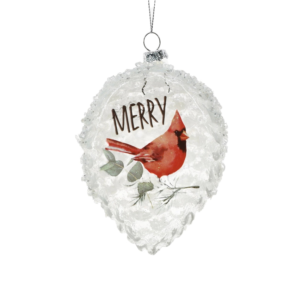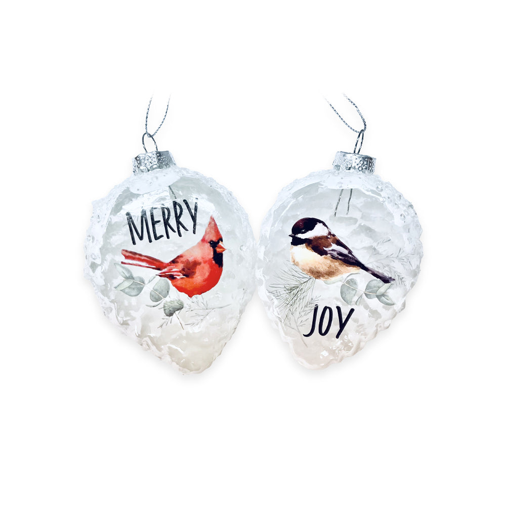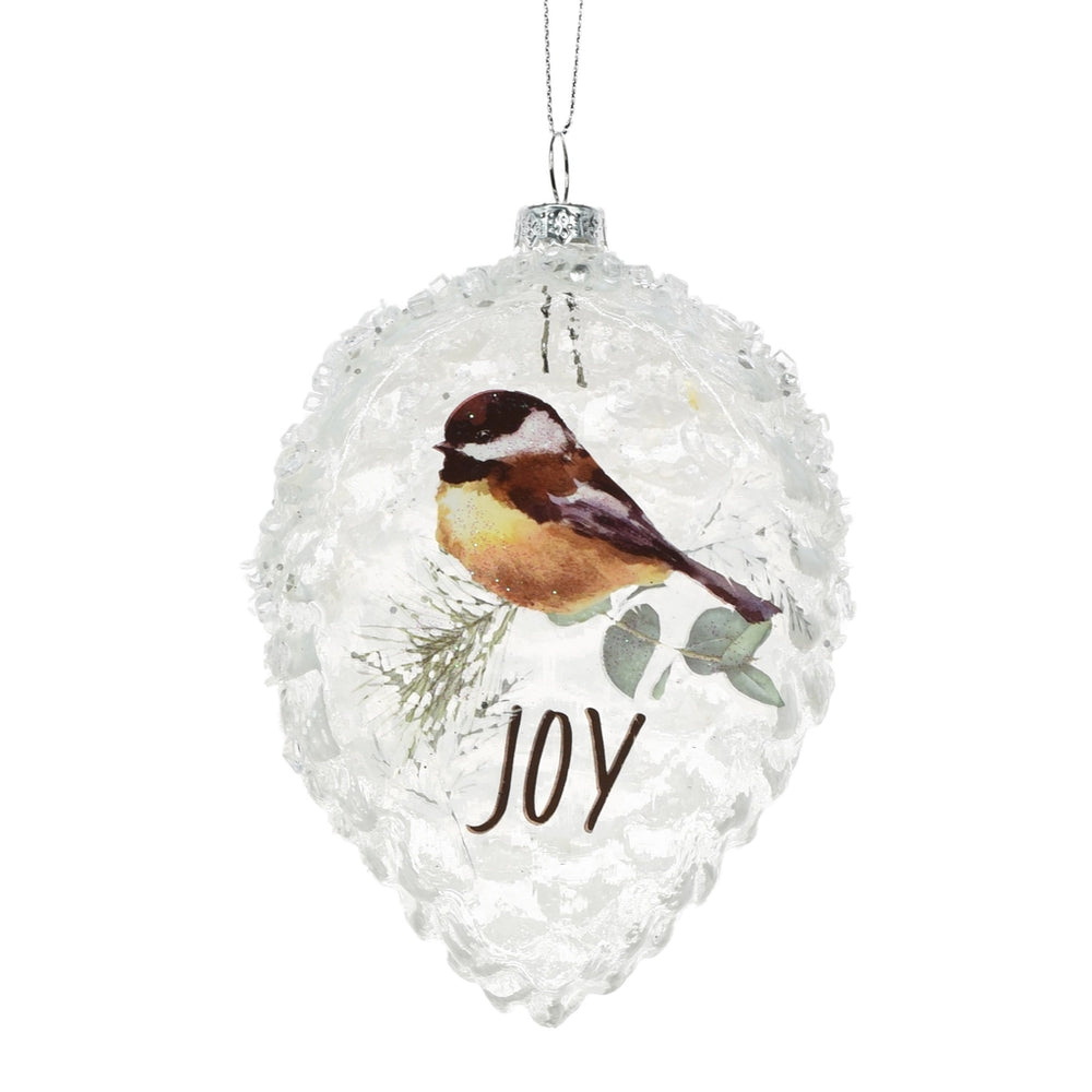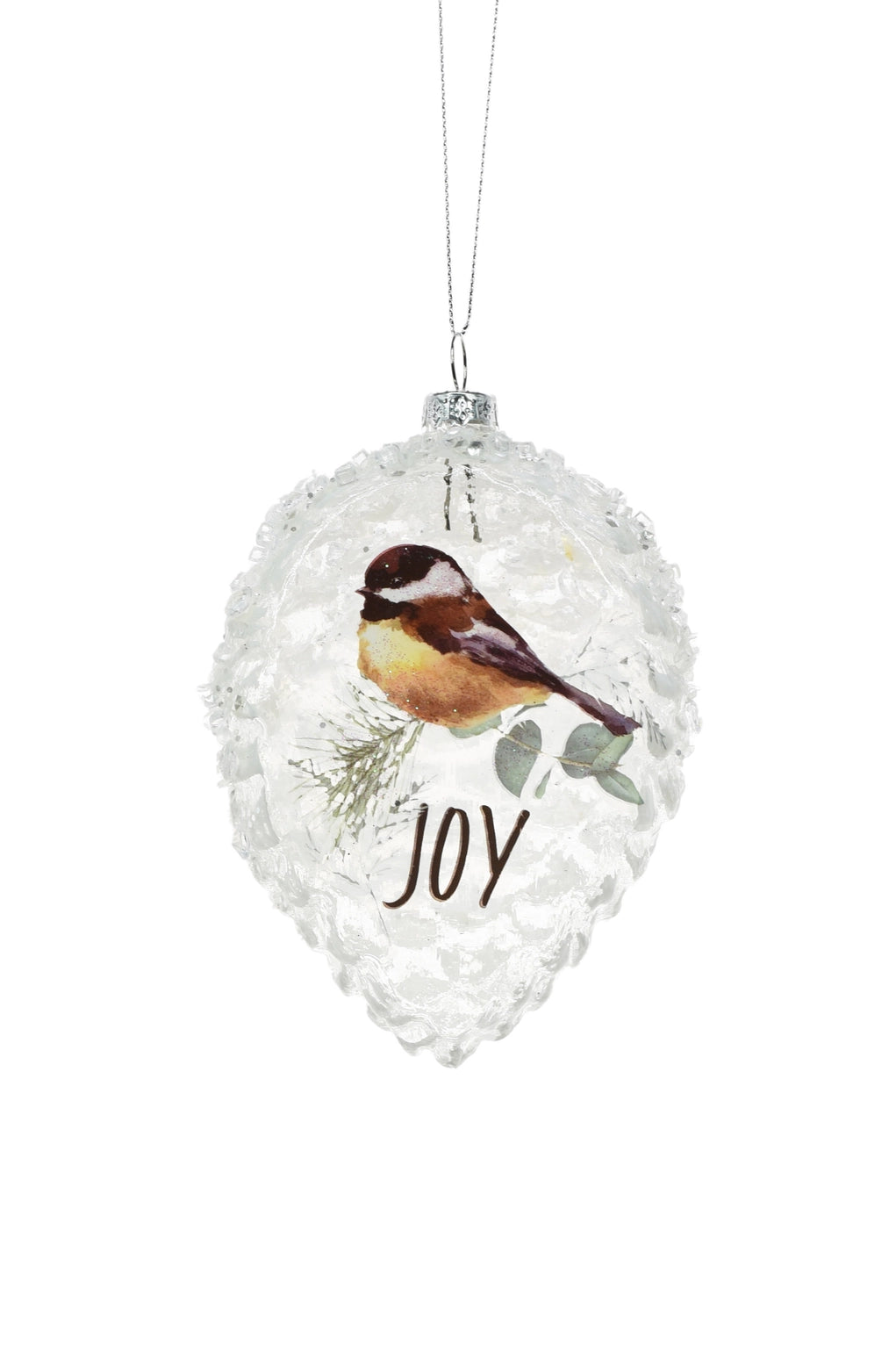 Handblown glass Sentiment Bird Ornaments have a layered glittery pincone back and beautifully hand-drawn detailed flat front. Perfect gift for the bird lover on your list!