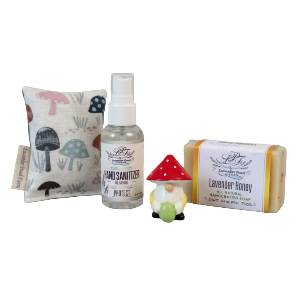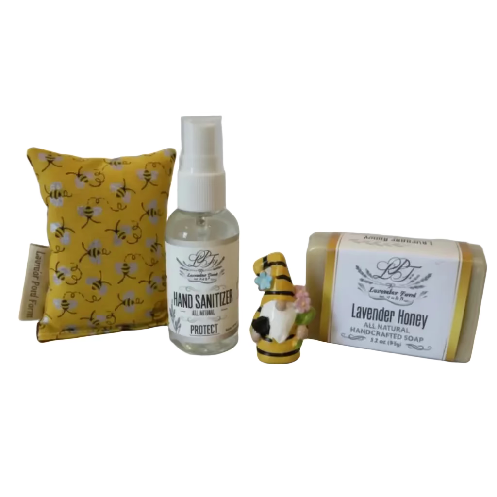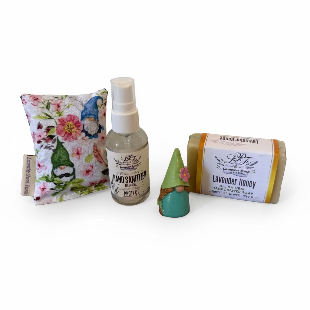 Includes a 2oz Lavender Hand Sanitizer , Lavender Honey Bar of Soap, Lavender filled Sachet and a mini table top/garden figurine!